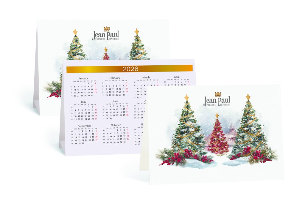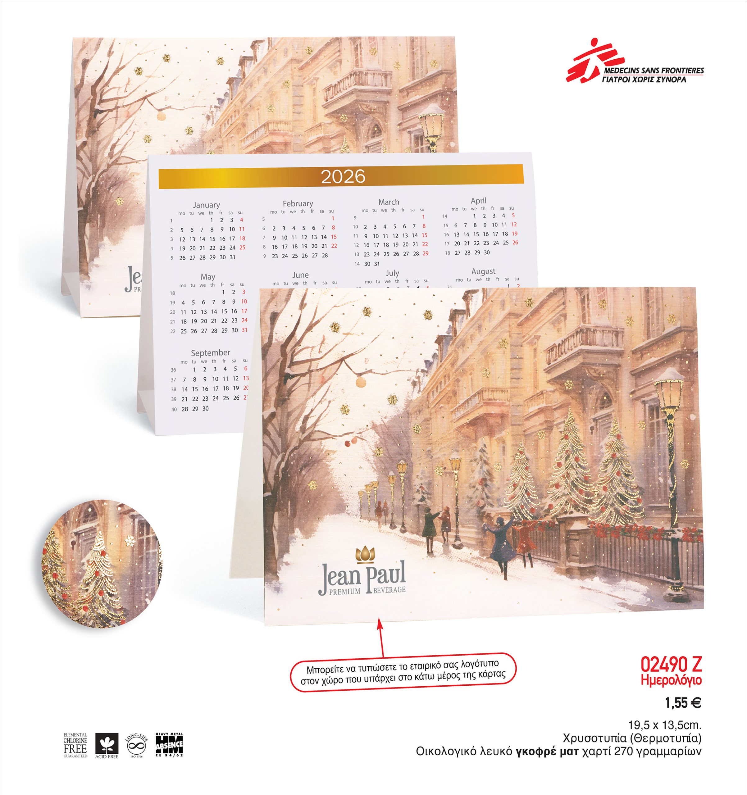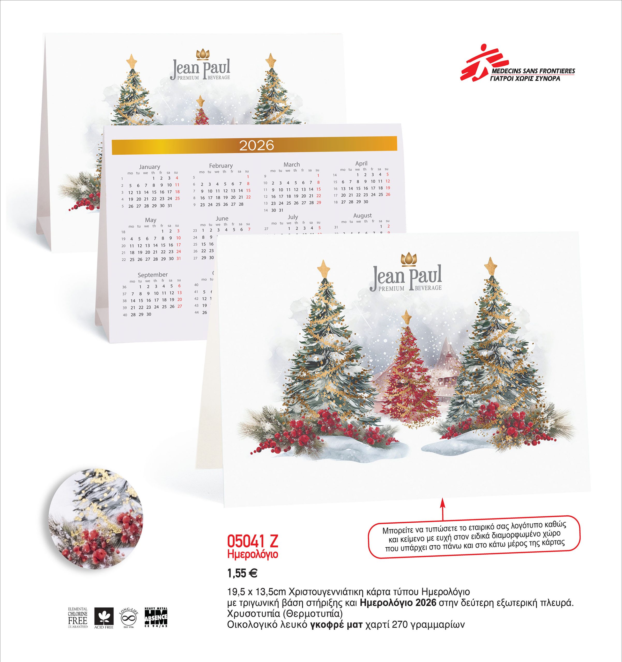 Χριστουγεννιάτικες κάρτες στις οποίες μπορεί να εκτυπωθεί και το εταιρικό σας λογότυπο σε διάφορες διαστάσεις καθώς και κάρτες τύπου ημερολογίου -2025- στην δεύτερη εξωτερική πλευρά με τριγωνική βάση στήριξης. Είναι κατασκευασμένες σε οικολογικά επιχρισμένα χαρτιά ή σε ιλουστρασιόν με UV varnish. Εκτυπώνονται με μέθοδο offset και είναι διακοσμημένες με διάφορα είδη θερμοτυπίας-foil (χρυσοτυπία,ασημοτυπία κ.λ.π.), περιλαμβάνουν επίσης και γκοφρέ επεξεργασία (εξώγλυφο). Συνοδεύονται από ασορτί αυτοκόλλητα φάκελλα.